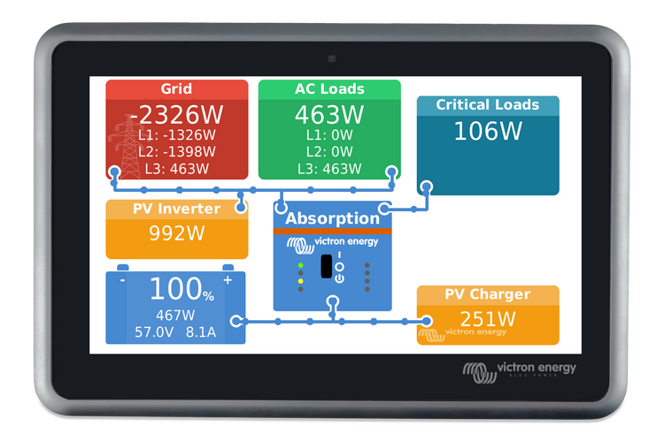 Voit vaivatta muodostaa yhteyden järjestelmääsi Victron Remote Management (VRM) -portaalimme kautta tai hallita sitä suoraan yhdysrakenteisella kosketusnäytöllä,