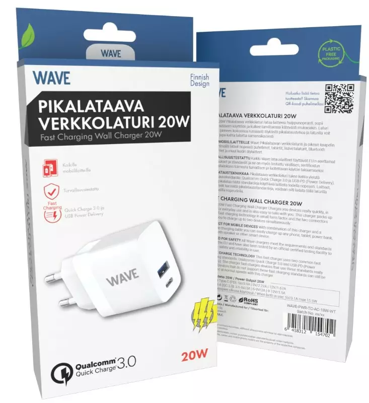 Wave Pikalataava Verkkolaturi lataa laitteesi huippunopeasti, sopii jokapäiväiseen käyttöön ja kulkee tarvittaessa kätevästi mukanakin. Laturi kätkee pieneen kokoonsa runsaasti älykästä pikalataustehoa ja laturilla voit ladata jopa kahta laitetta samanaikaisesti.