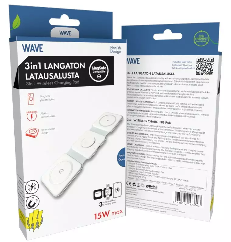 Tyylikäs avattava pakkaus. Tuote ja lisäinformaatio nähtävillä kannen sisäpuolella. Wave 3in1 Langaton latausalusta on täydellinen ratkaisu tarpeisiisi, kun haluat ladata langattomasti useampaa... Lue lisää